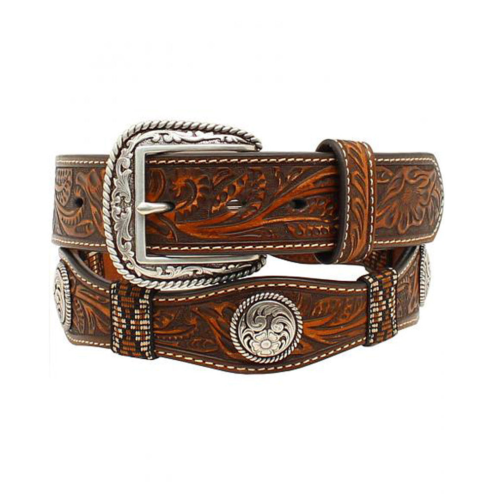 Accessorize with Ariat, and step up your cowboy look. This belt is made of genuine leather in a scalloped design and features a handsome floral embossed print. Textile ribbon accents and silver-tone western conchos add extra visual interest, while the silver-tone buckle and leather keeper are removable so you can add your own. Material: Leather.