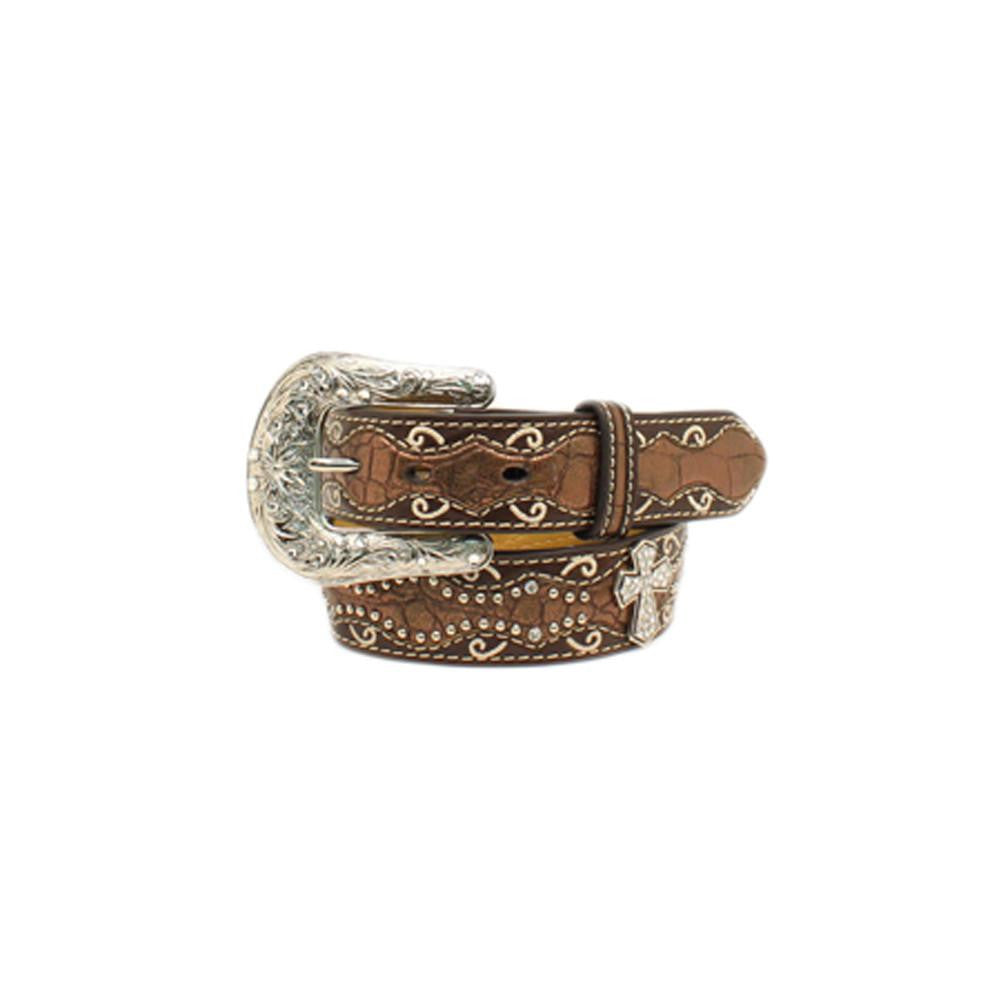 Stylish girls Ariat belt by M&F Western Products. This belt features an eye catching faux crocodile leather pattern accentuated with rhinestone cross conchos. Available in sizes 18-30. Material: Faux Leather.