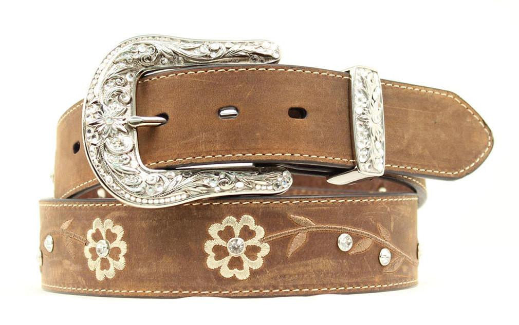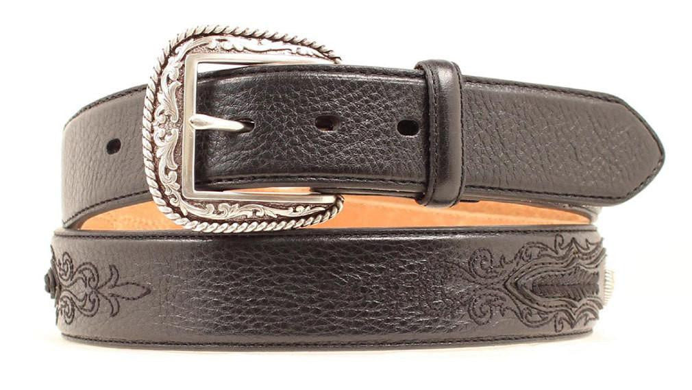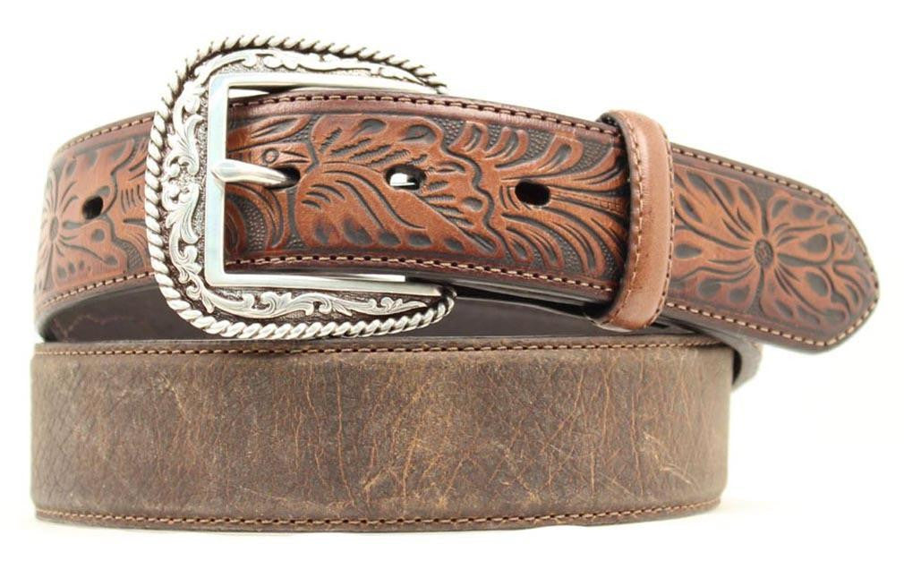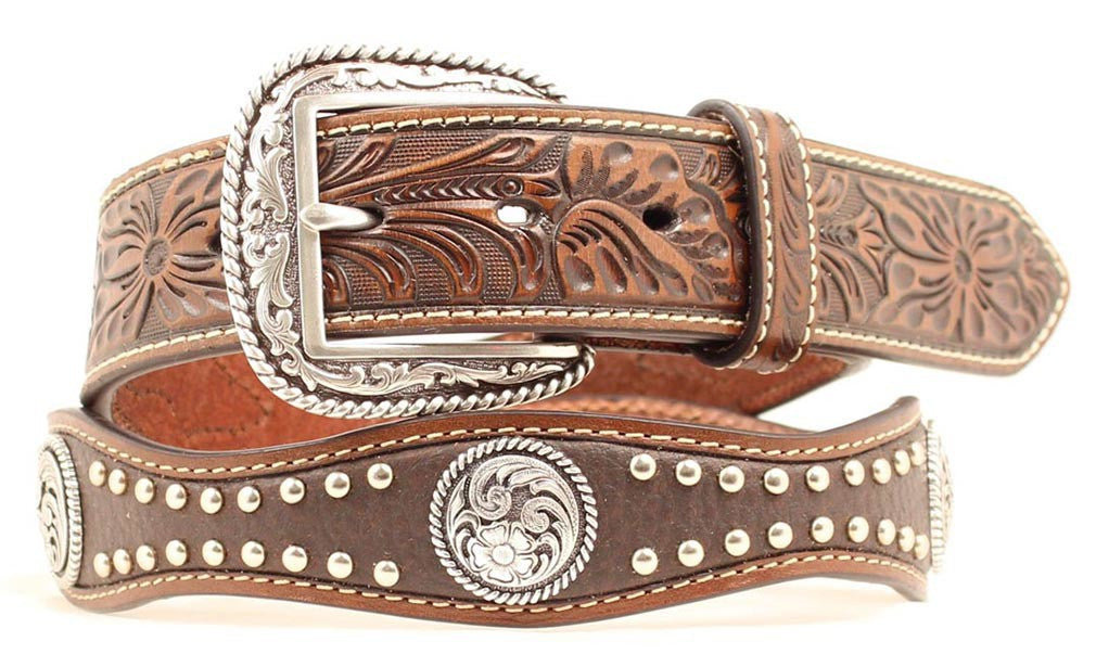 This buckle belt by Ariat is a great accessory for even the youngest of cowboys. This Ariat boy's belt by M&F Western Products features a ribbon inlay with round conchos on each end of the ribbon. Bold border stitching accents. Silver-tone buckle and leather keeper. Available in sizes 18-30. Material: Leather.