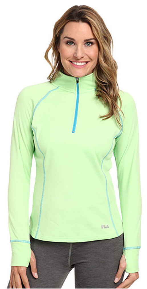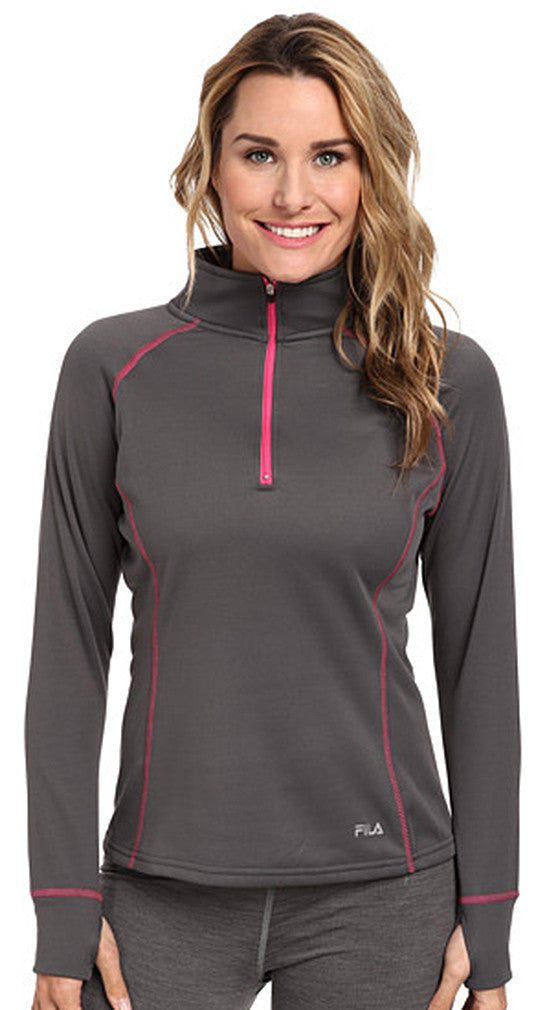 Warmth and comfort go hand in hand in this Fila training 1/4 zip shirt. Heat transfer silver Fila logo. Contrast color front zip and cover stitching. Thumbholes on cuffs. Comfort knit. Material: Polyester.