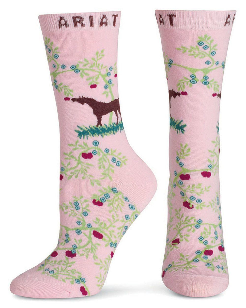 Horses love apples and girls love these whimsical ankle socks. This cotton and polyester blend ankle sock is adorned with and apple orchard and horse motif, and topped with an Ariat logo band.