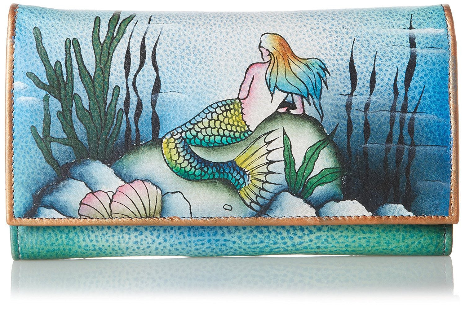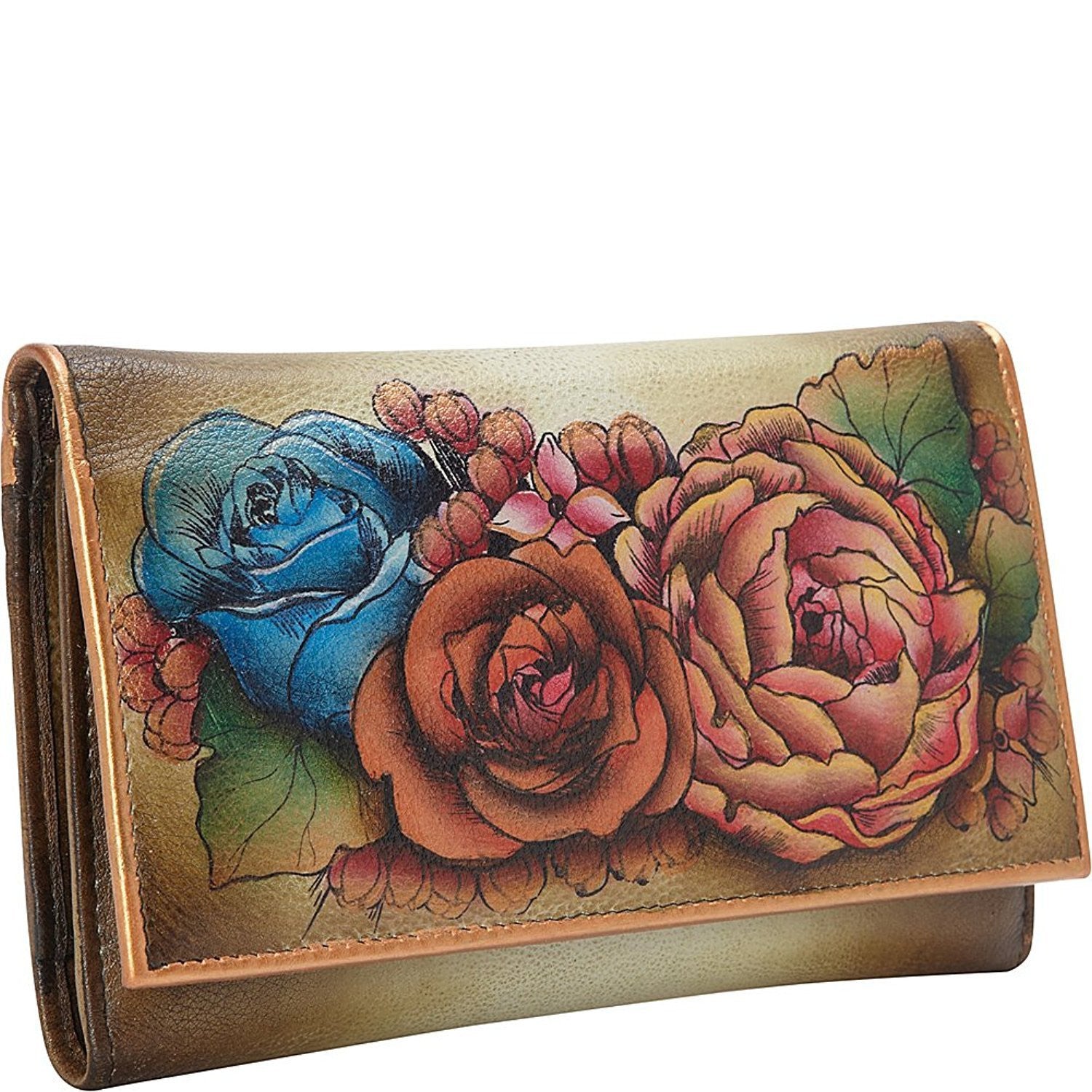 Hand-painted full grain leather gives this clutch wallet a distinctive texture and exceptional durability. The Check Book Leather Wallet-Clutch features: flap open entry, adjustable snap closure, 3 full-length pockets, one zip pocket, 13 card slots, 2 ID windows, one pen loop, rear full-length zip pocket, removable check book cover with extra slit pocket, 6 card slots and one ID window. Dimensions: 7.25'' x 4.25'' x 1''. Material: Leather.