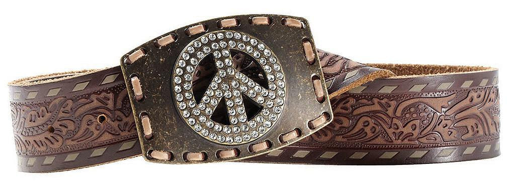 Bohemian bling for both the city and country girl. Antiqued tooled leather strap with buck-stitch detailing, and a classic brass buckle that flashes a rhinestone peace sign. Belt width: 1.5''.
