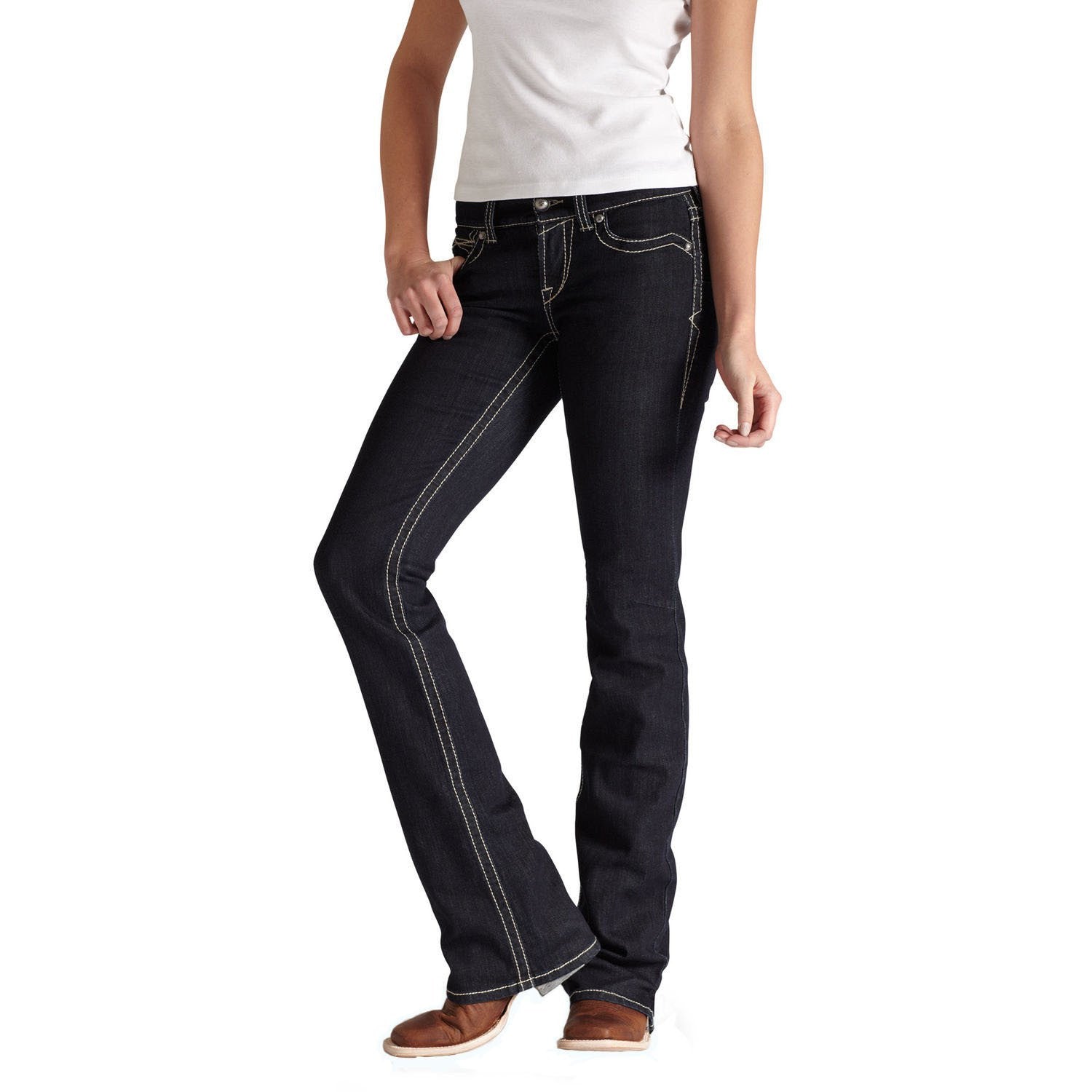 Wear-tested by riders and thoughtfully engineered, Ariat's Real Riding Jean is fit to perform. Jeans feature a flattering dark wash with slight whiskering, contrast stitching, stylish back pocket detailing and hand sanding for premium styling. Mid-rise with contoured, no gap waist band, core control panels for a slimmer front, mid-rise back with darts to lift and flatter, no-rub comfort inseams, anchored belt loops, extra room in the knee for movement and a boot cut leg opening. Material: 92% Cotton, 6% Polyester, 2% Spandex.