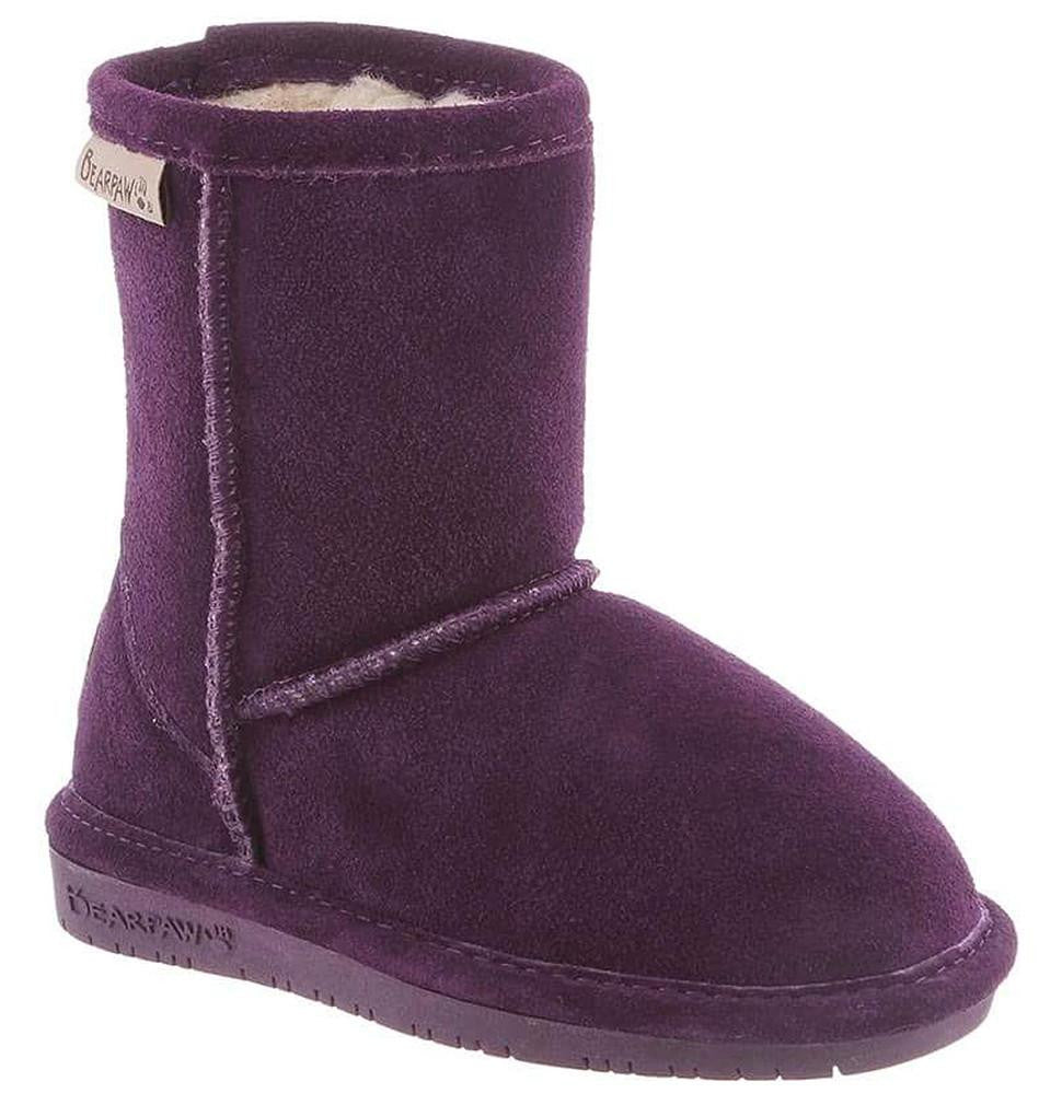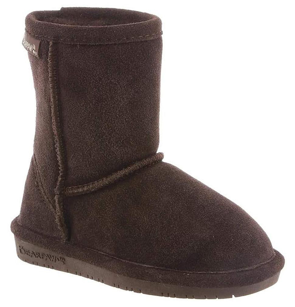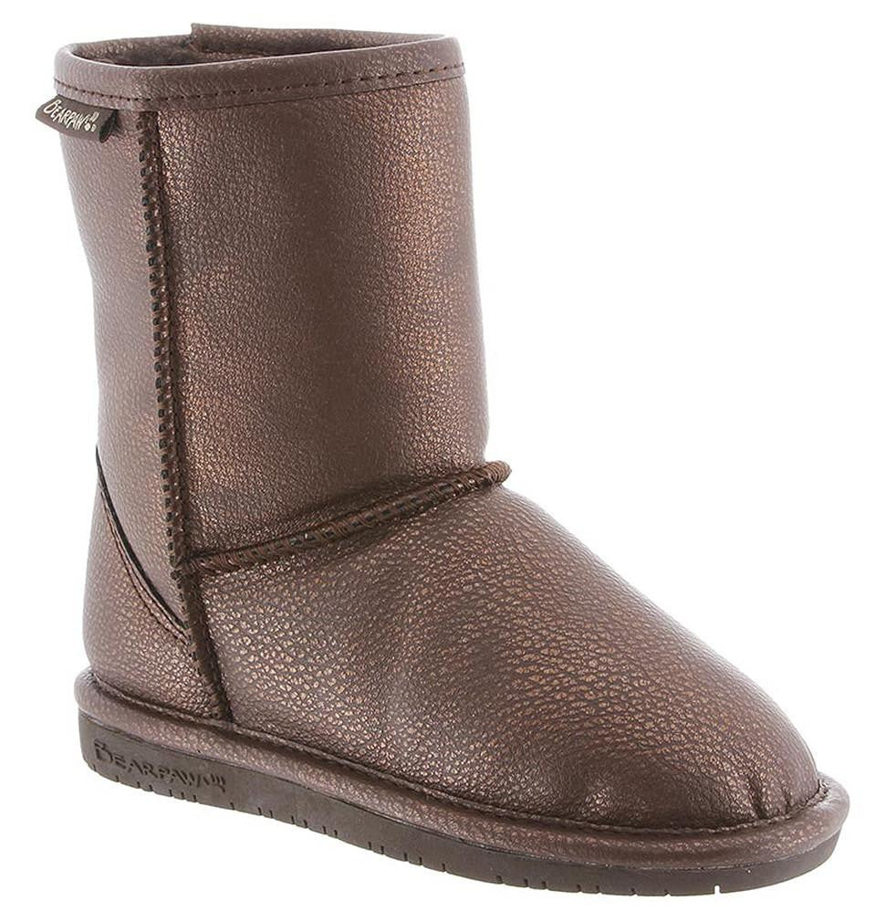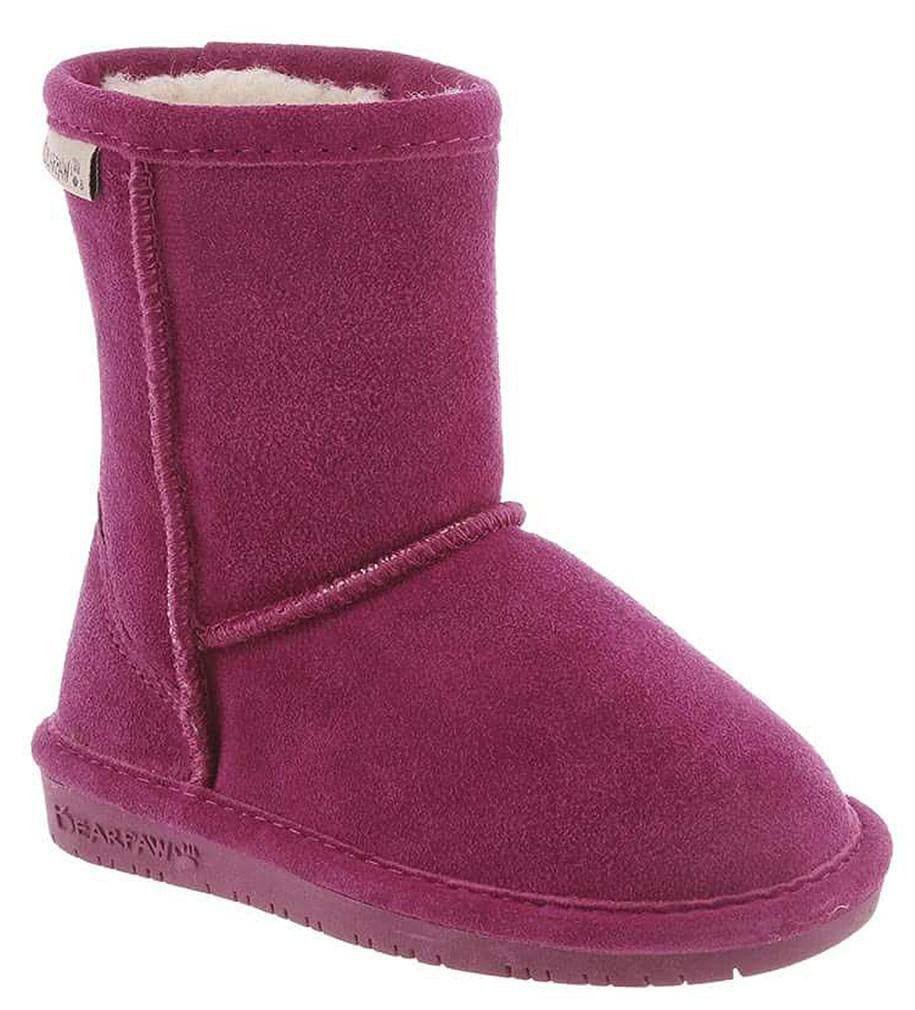 The Bearpaw classic Emma Boot has been sized down to fit your toddler perfectly! The genuine Sheepskin and wool blend lining will make it easy for her slip on these boots and go. This is a versatile, warm, lightweight, and super stylish boot. The newly designed treaded Rubber sole offers improved grip and durability. Soft cow Suede or distressed metalic faux Leather upper, classic low profile TPR Rubber wedge outsole. 5'' tall. Material: Suede, Rubber.