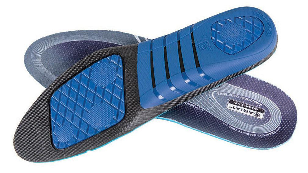 Low-friction, moisture-wicking sockliner for comfort. Temperature managing X-Static layer provided odor protection. PU elastomer compound layer disperses shock and reduces impact. Cushioned forefoot pad protects small bones and nerves. Cushioned heel pad for shock absorption.