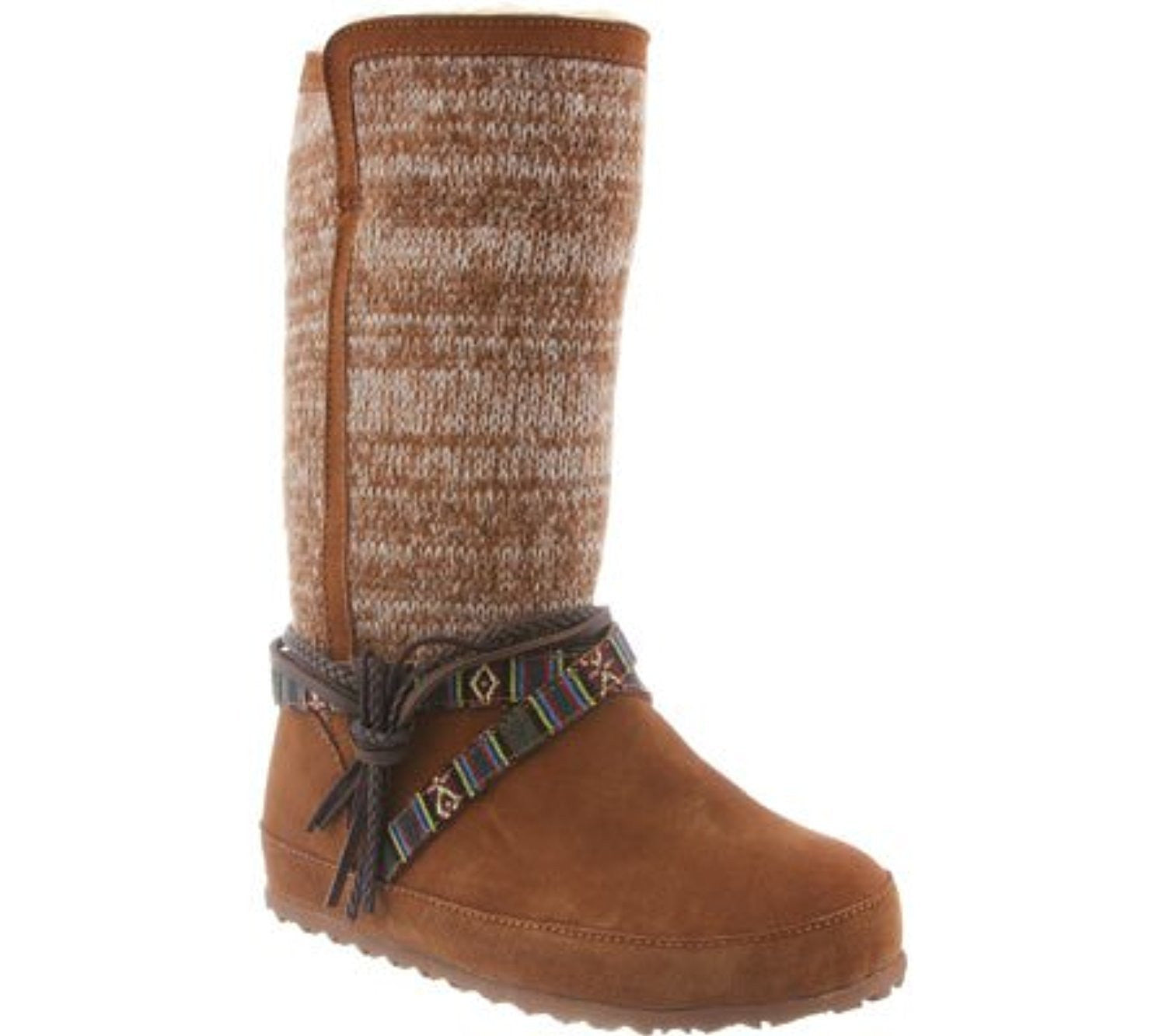 Looking for something comfy and trendy that will keep your feet warm? Then look no more! This stylish suede boot with marled knit shaft upper can be folded down or worn up. Helena Boots feature cow suede with marked knit shaft upper, accented with textile straps, braided ropes and straw artisan details, wool blend lining, sheepskin (Fur, Sheep) covered, comfort Constructed EVA footbed, durable TPR outsole, alternating treads for added traction and are protected by NeverWet Superhydrophobic Technology by Rust-Oleum. NeverWet is extra layer of protection from stains that include mud, cola, wine, grape juice and syrup. The treatment helps prevent discolorations and spotting. NeverWet's superhydrophobic crystal clear formula allows fabrics to breathe while keeping water away from the surface. The treatment also has self-cleaning properties that help dirt and debris rinse away easily. Boot height: 11.7'' tall. Material: Cow Suede, Wool, Sheepskin Fur, Rubber.