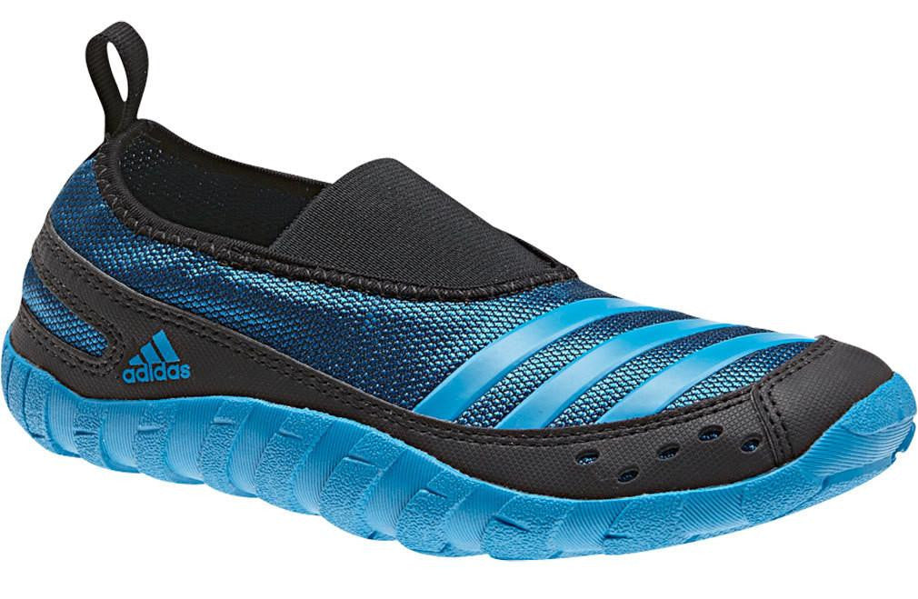 These adidas Jawpaw kids' shoes have a snug wraparound design and an open mesh upper that breathes on dry land and drains quickly in the water. And with elastic at the shoes' opening, they slip on with ease and stay on comfortably.