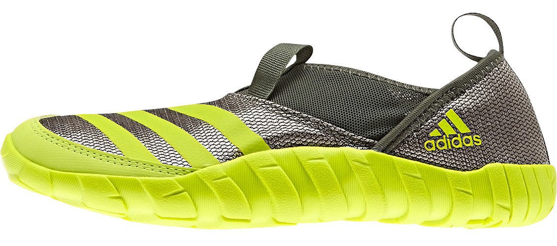 These adidas Jawpaw kids' shoes have a snug wraparound design and an open mesh upper that breathes on dry land and drains quickly in the water. And with elastic at the shoes' opening, they slip on with ease and stay on comfortably.