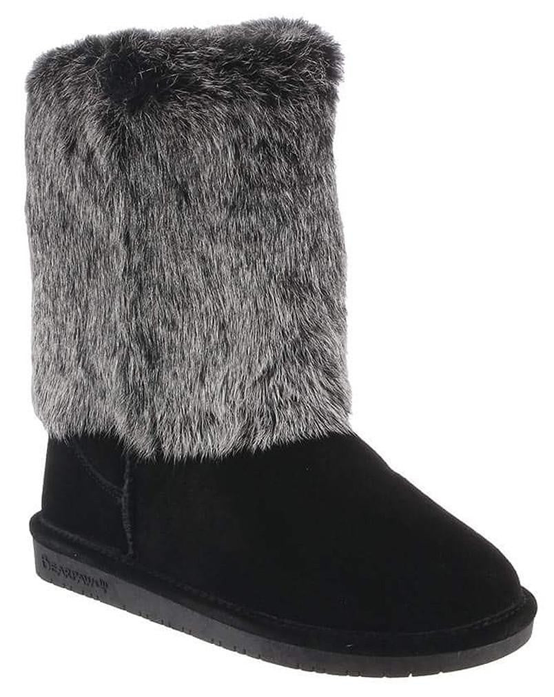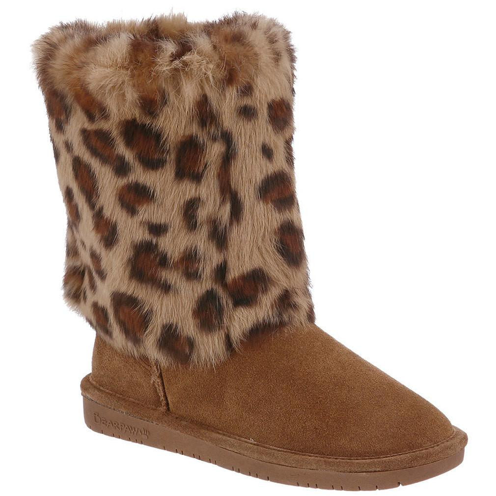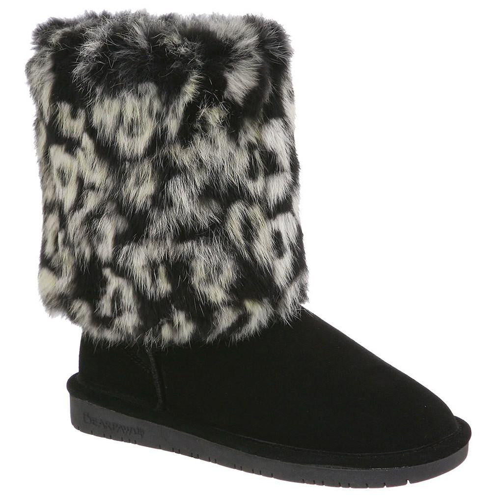 The ombre look applied to the rabbit fur of the Bearpaw Keely make this boot a show stopper. Your foot will be enveloped in comfort with a wool blend lining for warmth and a cushiony sheepskin footbed. Color fade accent or animal print detail. Classic low profile TPR rubber wedge outsole. Nine inch tall.Material: Suede, Sheepskin.