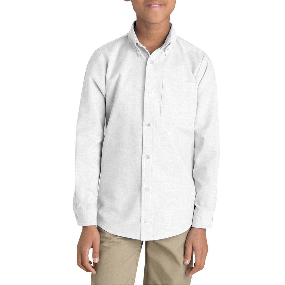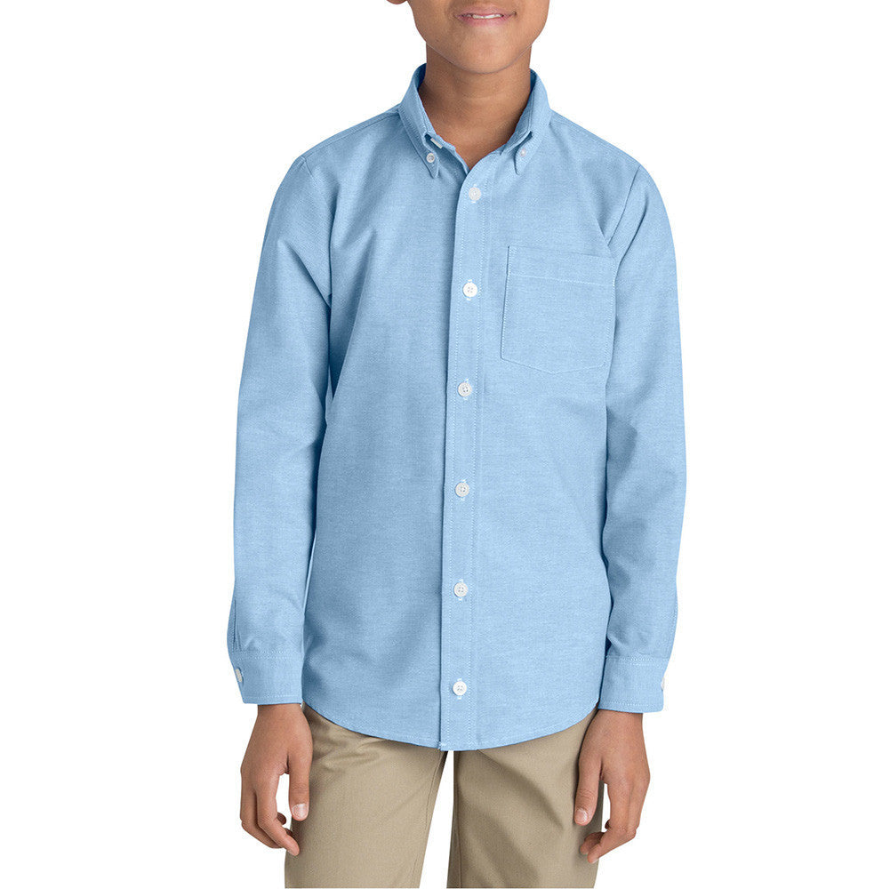 A classic oxford shirt great for a school uniform or a special occasion. A spacious fit for ease of movement. Easy care stain release. It features placket front with Dickies logo buttons, button down banded collar, single chest pocket. Resists wrinkles. Material: Cotton, Polyester.