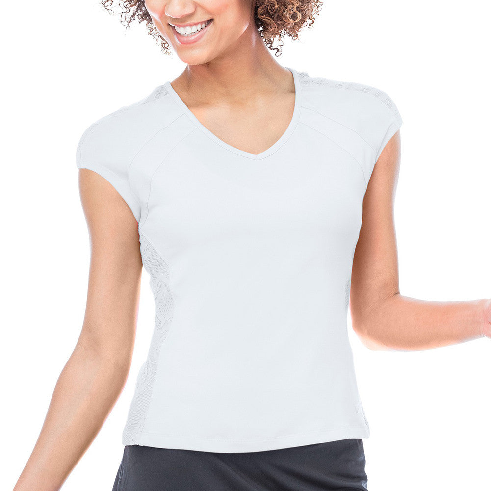 Sporty, stylish and professional, this Fila Lure Short Sleeve Top Shirt features a V-neck with tonal ribbed binding, feminine cap sleeves with raglan cut provides increased range of motion, tonal textured mesh inserts at shoulders and center back, moisture-wicking performance, stretch fabric for enhanced mobility, 30+ UV protection, and a reflective heat transfer Fila F-Box logo at left hem. Material: Polyester, Spandex.