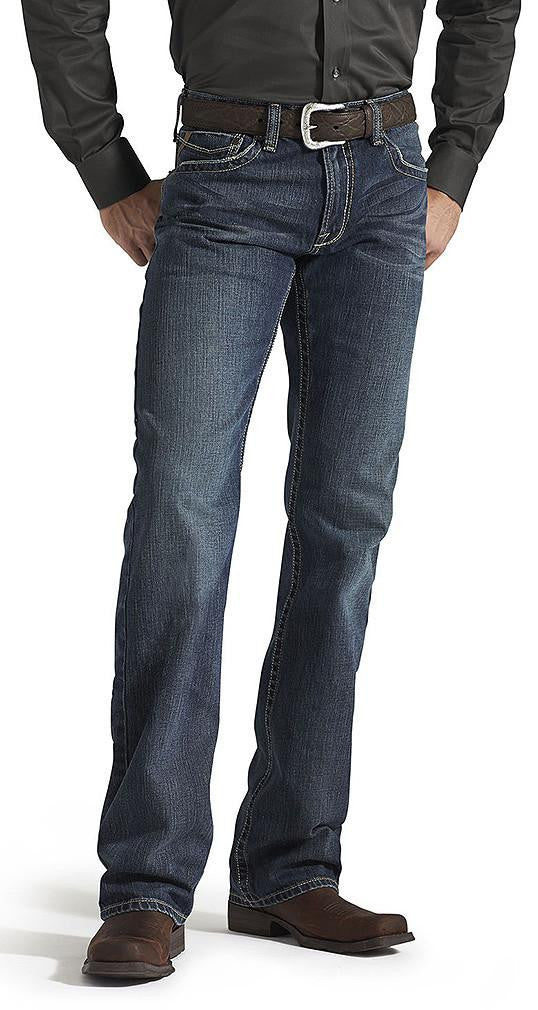 Men's Ariat western denim. These are nice jeans! Deadrun A M4 low-rise, boot cut, medium tinted wash jeans. Hand sanding, whiskers, and leg chevrons. 13.5 oz. denim, and 100% cotton. Mixed technique embroidery on the fashion back pockets, and a loop lock.