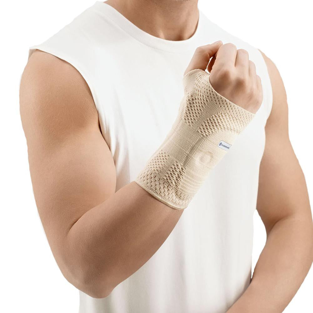 Bauerfeind's ManuTrain wrist braces and supports provide stability and comfort to painful wrists. ManuTrain wrist supports take the strain off your wrist and provides pain relief. To do this, the flexible soft knitted fabric has padded inserts incorporated into it, which takes pressure off nerves and blood vessels and provide soothing pain relief. The brace conforms to your wrist shape for a secure hold. The ManuTrain brace takes the strain off your wrist and soothes wrist pain. Gentle compression accelerates the healing of soft tissue irritation. ManuTrain is useful for Carpal tunnel syndrome, inflammation of the tendon in the wrist, arthritis, overuse, or following an injury. As you move your hand, the support reacts and provides a massaging effect for soothing pain relief. An adjustable strap lets you control the amount of compression for excellent comfort and an adaptable stay can be added for even more stabilization. Adding to the level of comfort, the soft, machine-washable knit fabric is lightweight and breathable. To wash, machine wash in the gentle cycle, which helps maintain its elasticity and original fit. Material: Knit Fabric, Viscoelastic.
