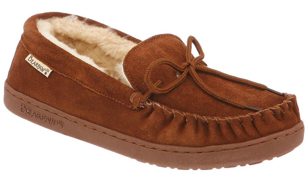 Start a movement: wear your slippers to work day! When you feel the comfort and warmth of the full sheepskin lining with classic moc styling, you'll never want to wear anything else. Cow suede upper. Full sheepskin lining and footbed. Hand stitched vamp with lace detail. Woven collar logo. Classic cupsole molded TPR rubber outsole.