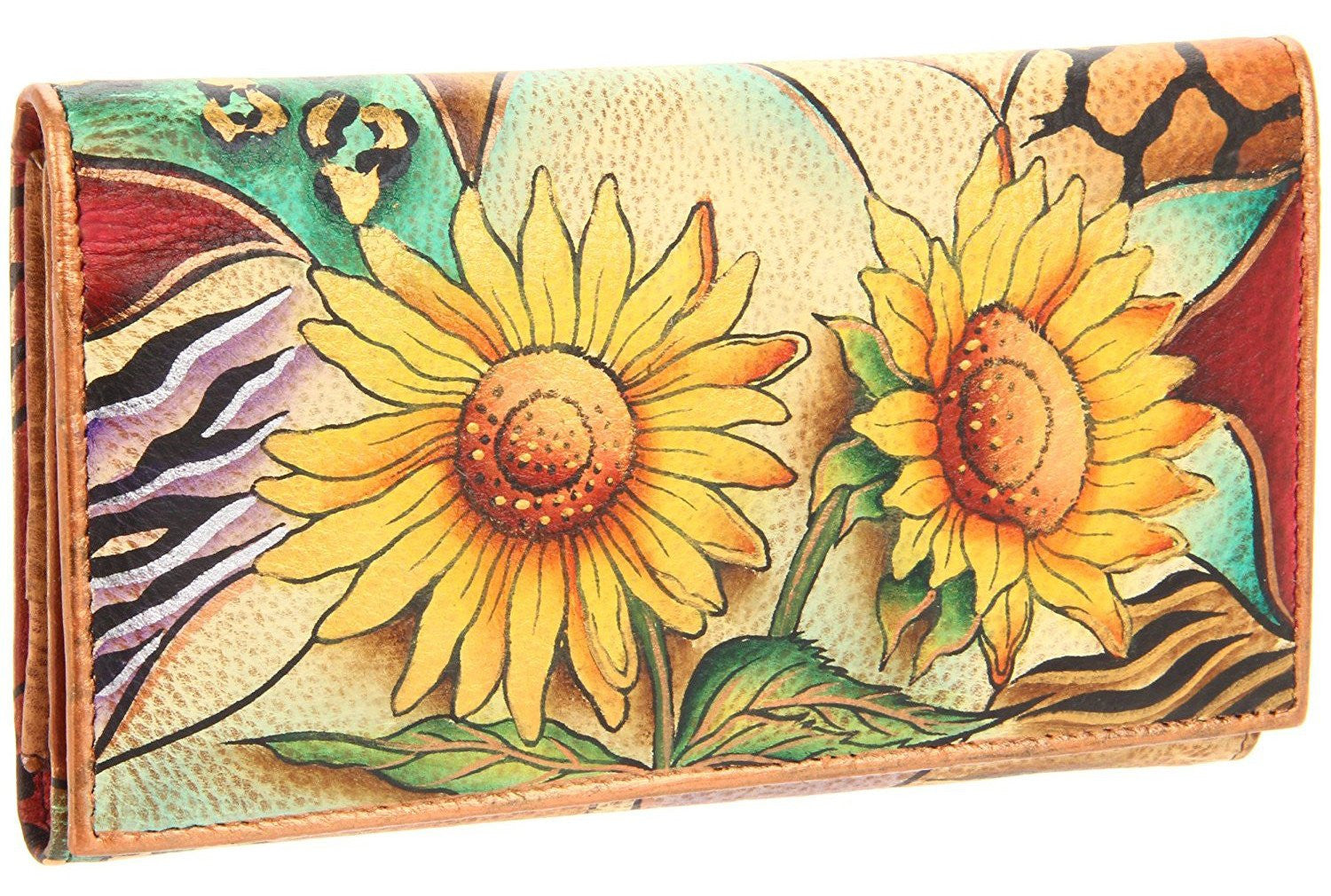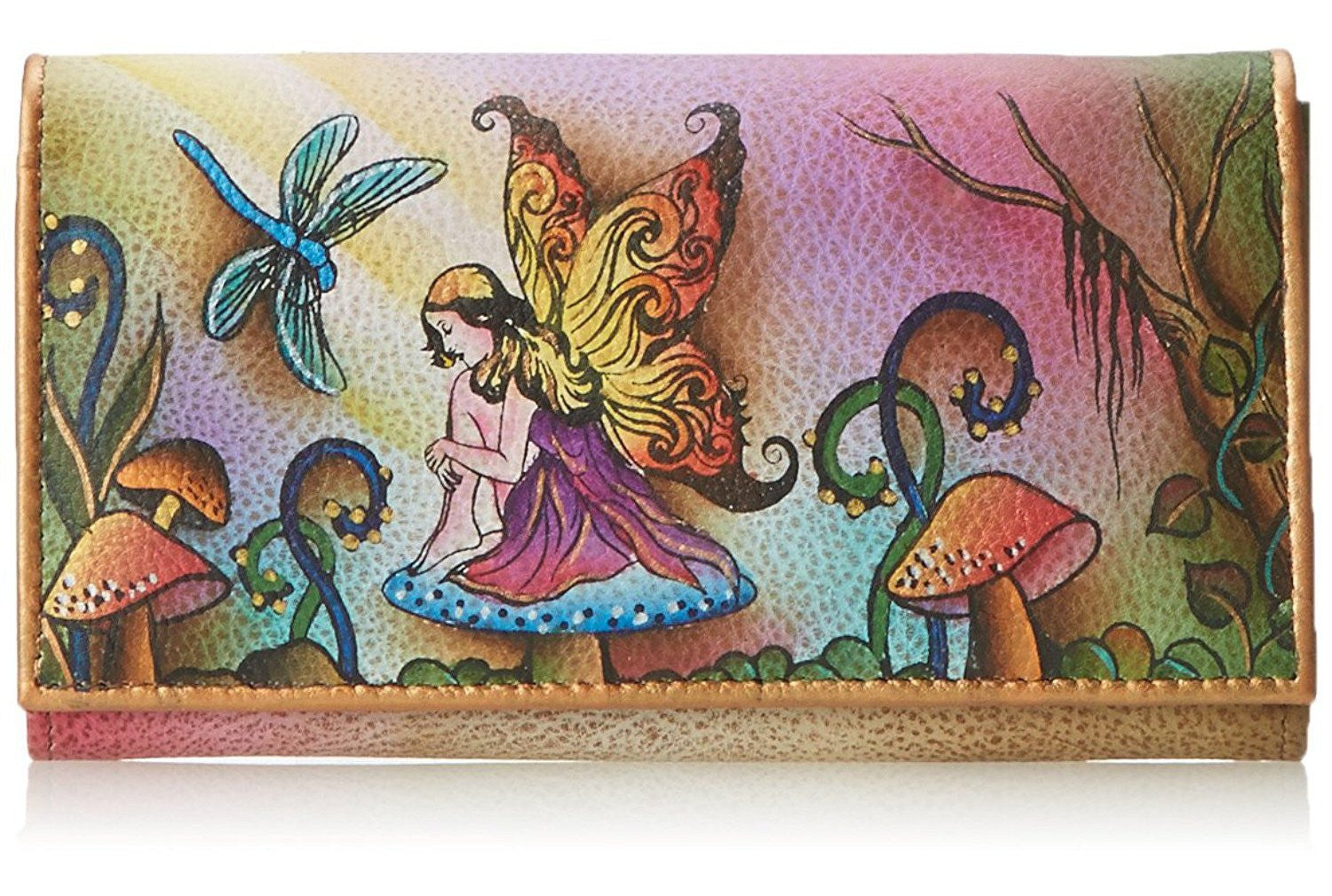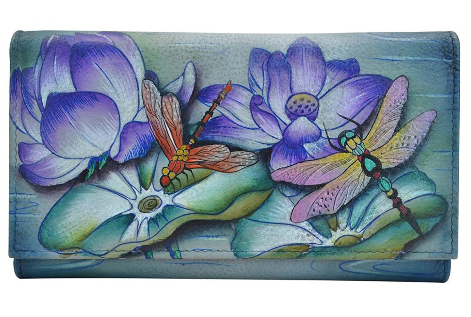 This pretty piece holds all your necessities and then some. The Multi Pocket Wallet-Clutch features: Flap open entry with adjustable snap closure, 4 full-length slit pockets, 2 full-length zip pockets, 12 card slots, one ID window, one gusset compartment, eear full-length zip pocket and slit pocket combo. Wallet is made of genuine leather and hand painted. Dimensions: 7.25'' x 4.25'' x 1''. Material: Leather.