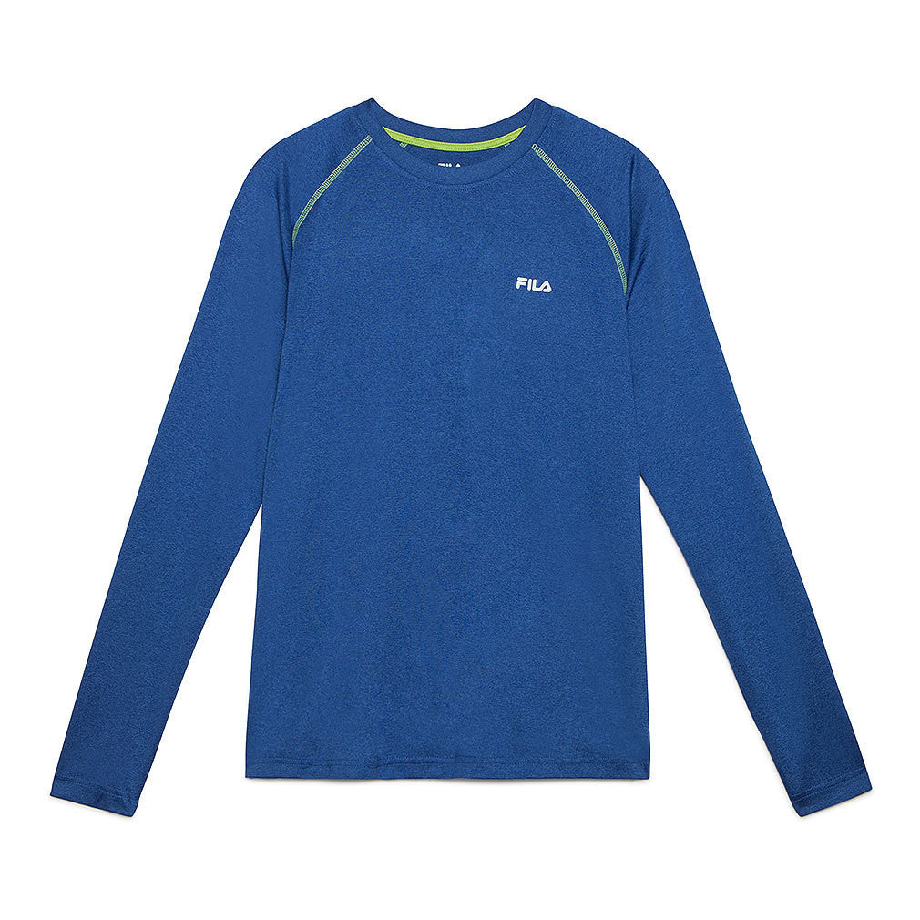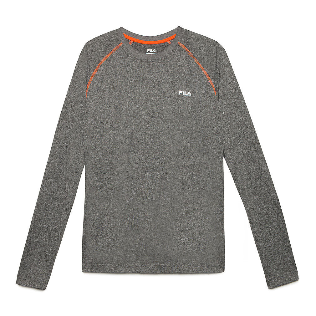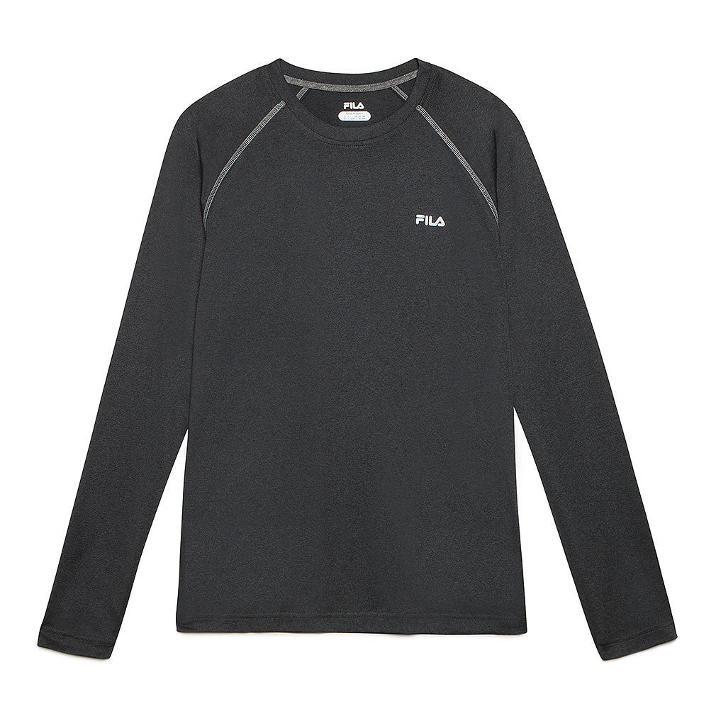 Stretch heather jersey: 96% polyester / 4% spandex. Silver heat transfer FILA logo. Contrast color coverstitching on raglan seams and neck tape.