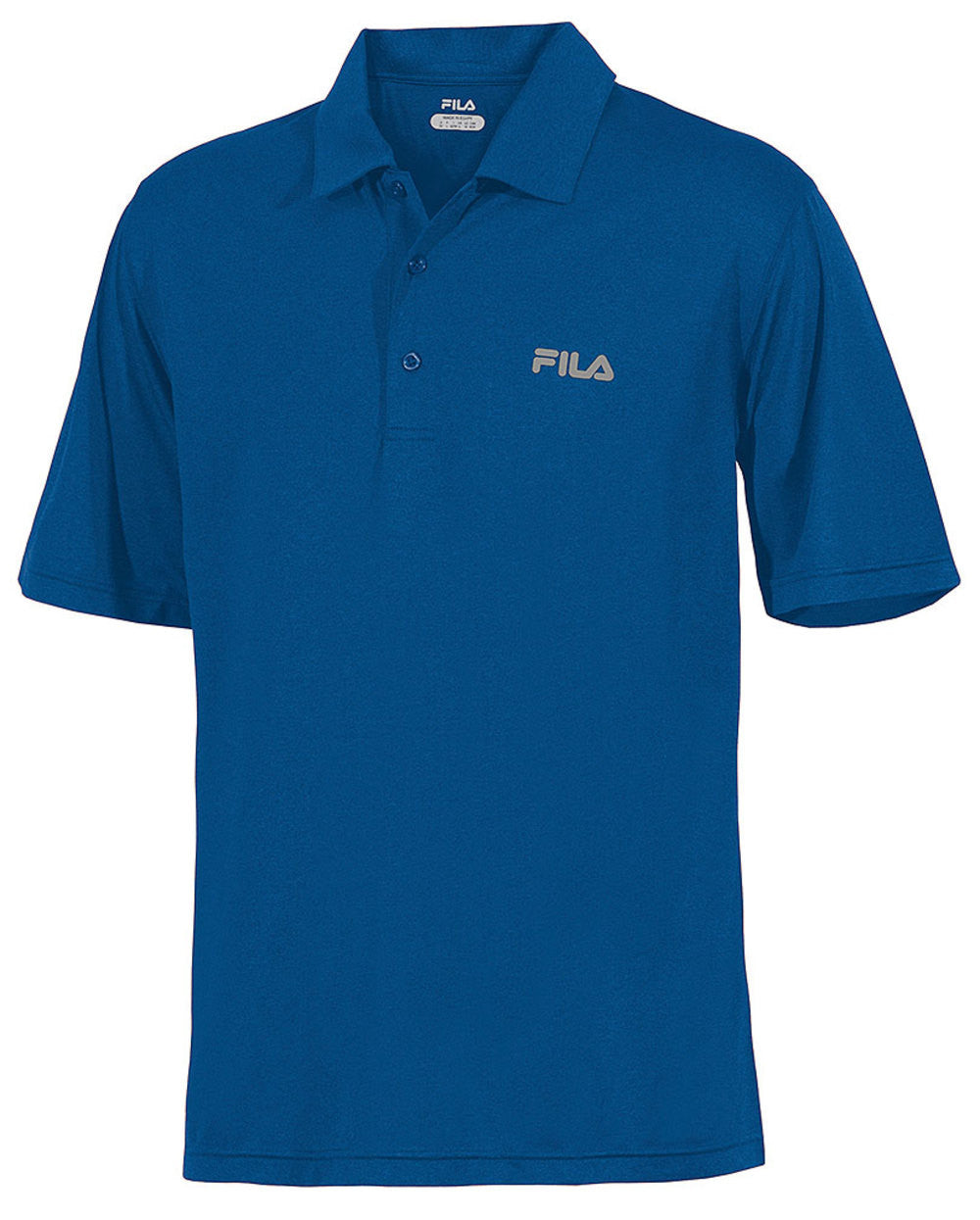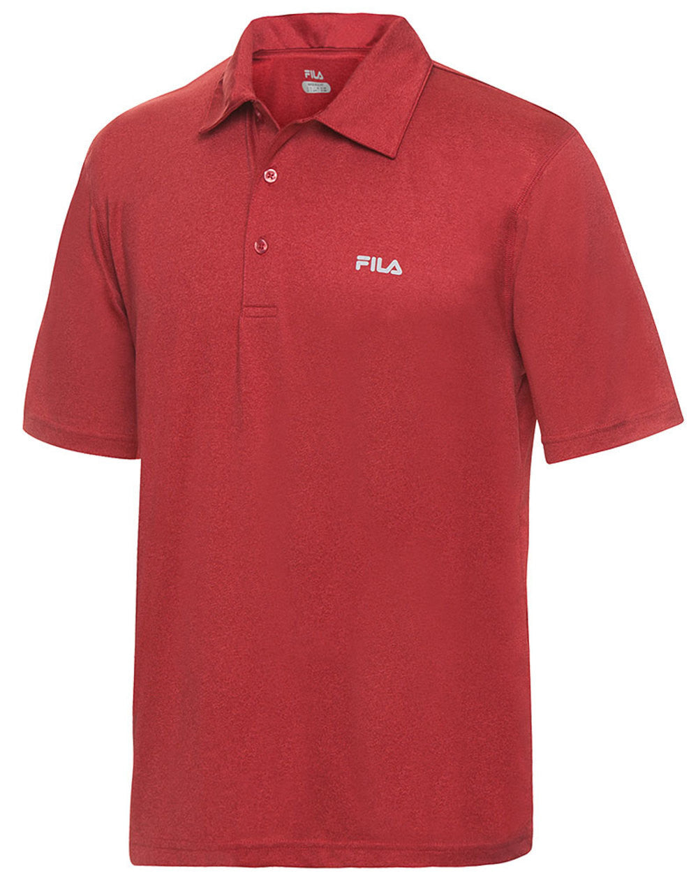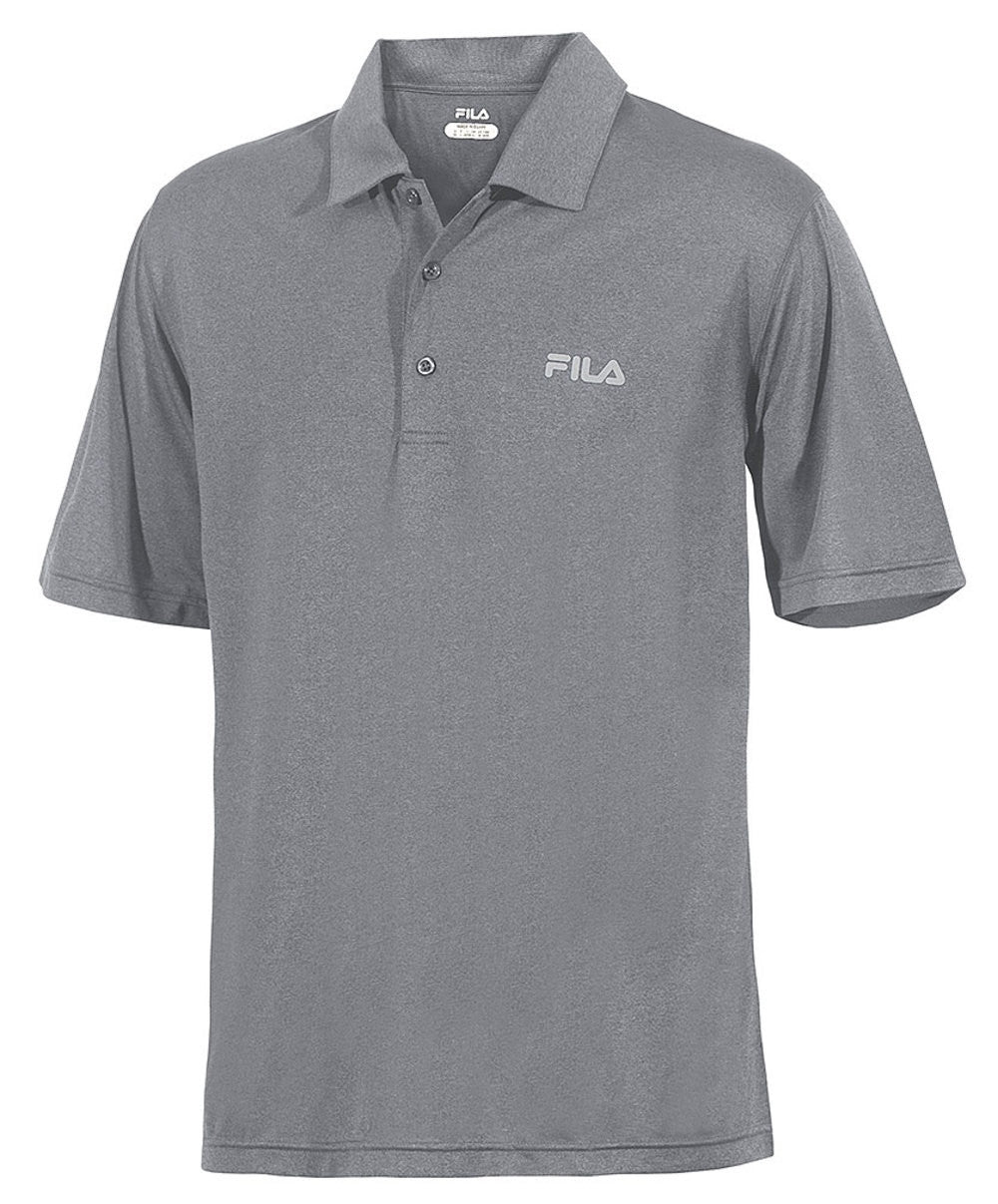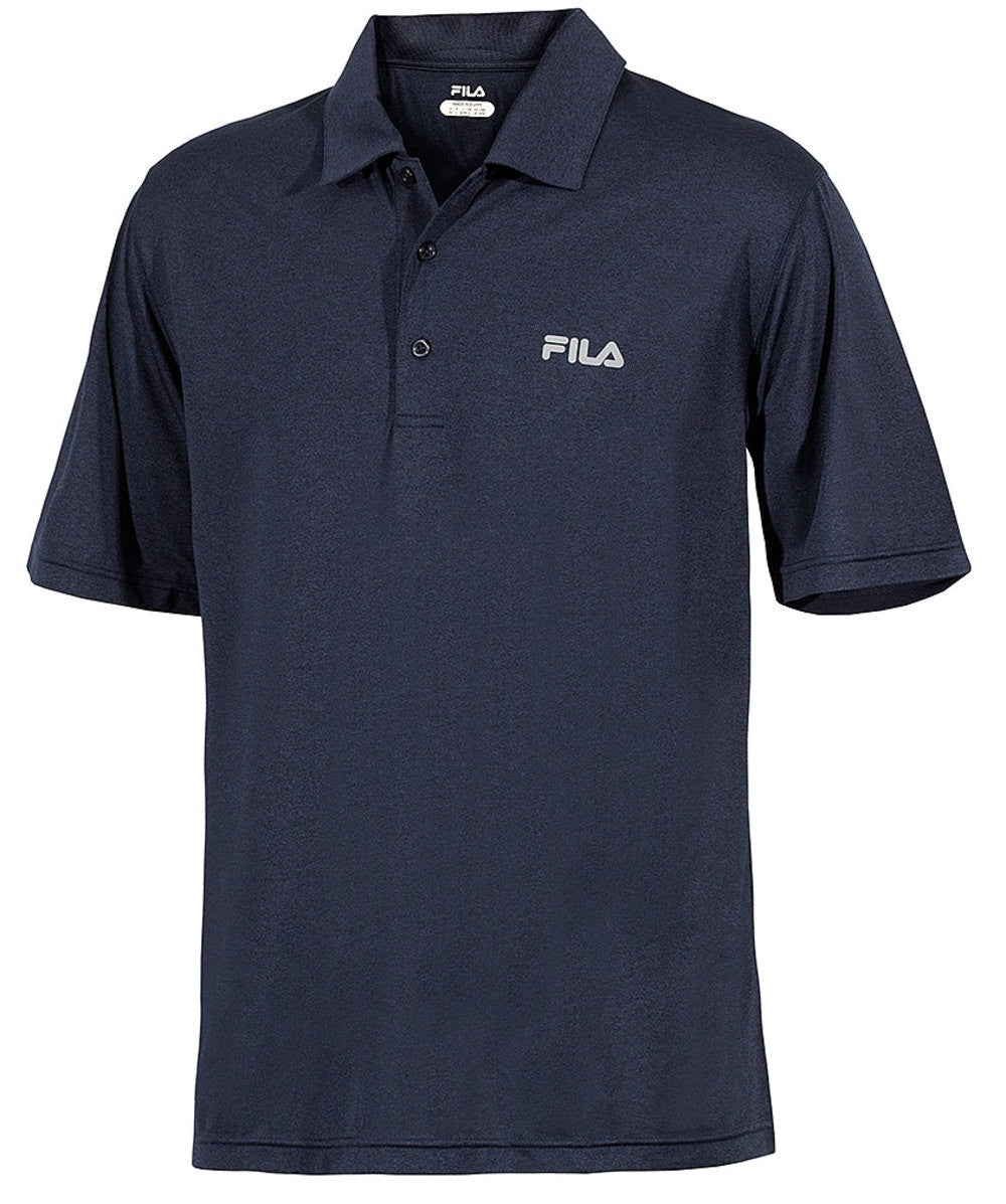 Stretch Heather Jersey: 96% polyester/ 4% spandex. Wicking fabrication pulls moisture away from your body. Reflective silver heat transfer Fila logo. Set-on sleeve. Three button placket. Self fabric collar.