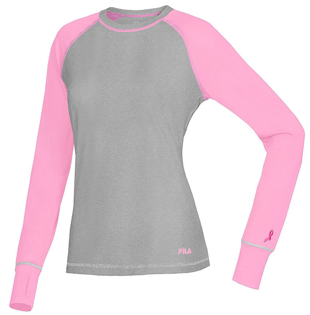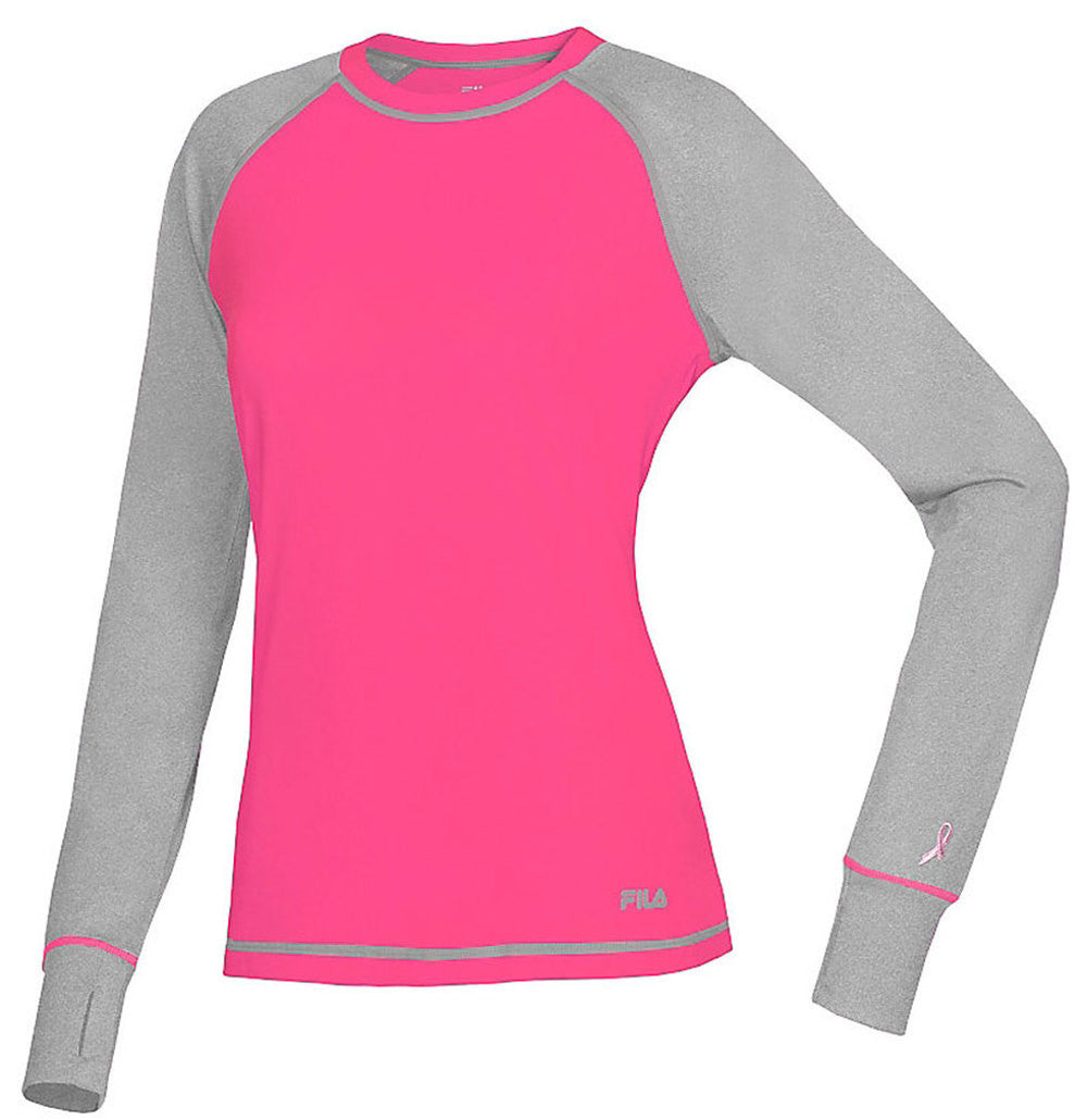 Colored heat transfer Fila logo. Sporty crew neck. Contrast color stitching. Thumbholes on cuffs. Pink ribbon embroidery on sleeve. Stretch jersey: 96% polyester/ 4% spandex.