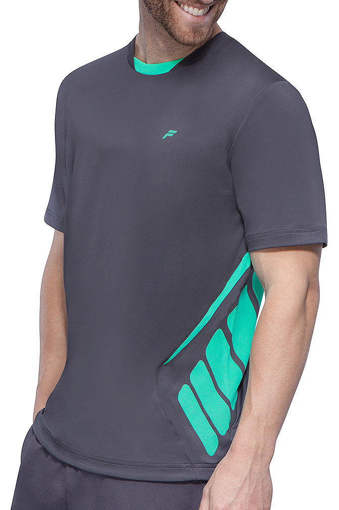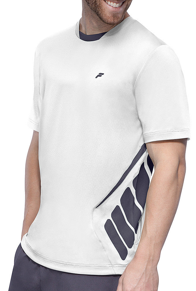Dominate the competition in this high-tech marvel of a top. Dynamic designs keep you looking fresh while the anti-odor technology keeps you feeling fresh. Silver reflective heat transfer speed Fila logo. Embossed elastic neck tape. Laser cut out no sew design on side panels. Material: Polyester, spandex, lycra.