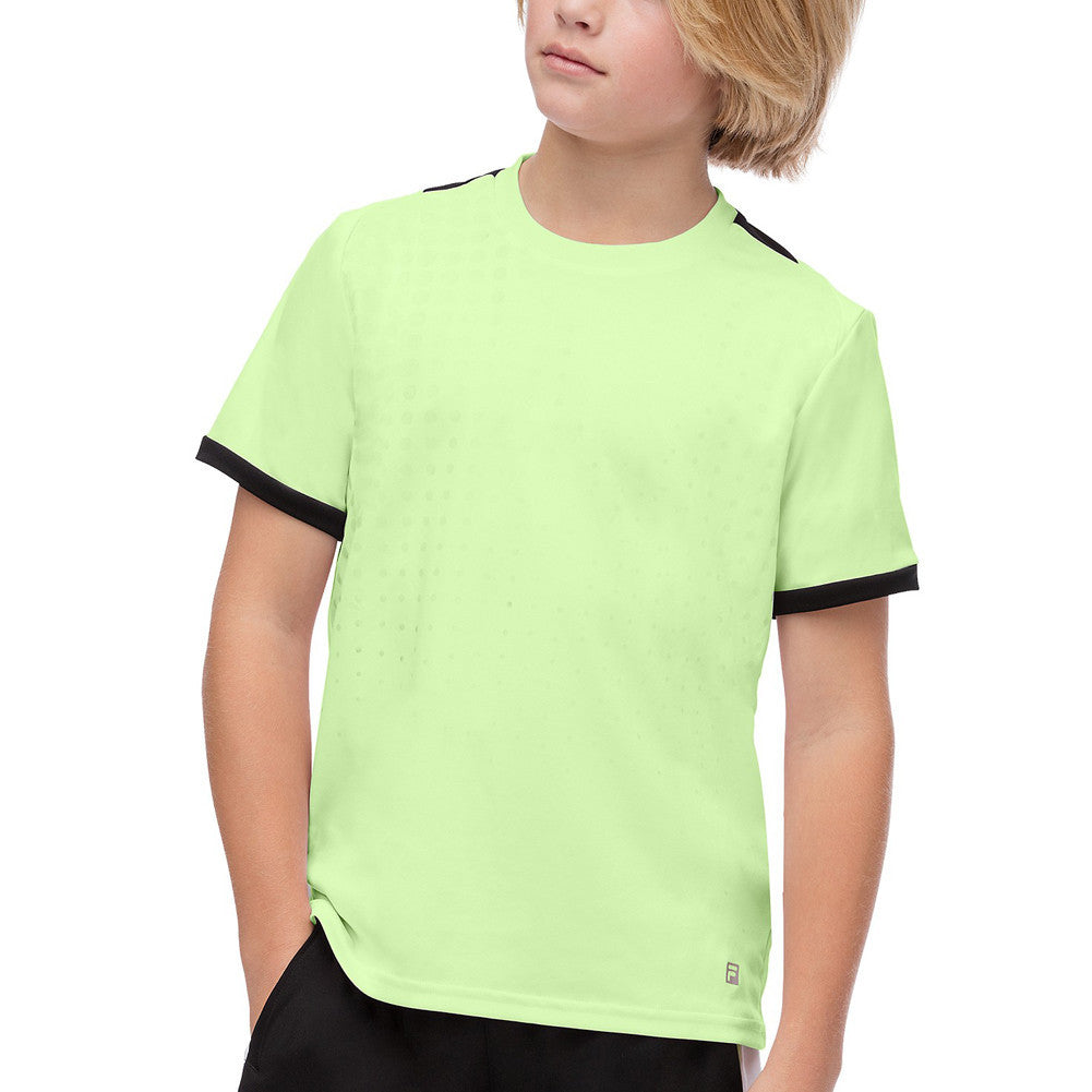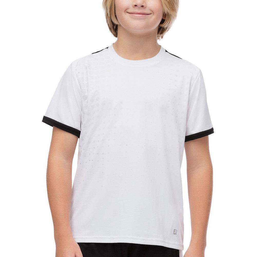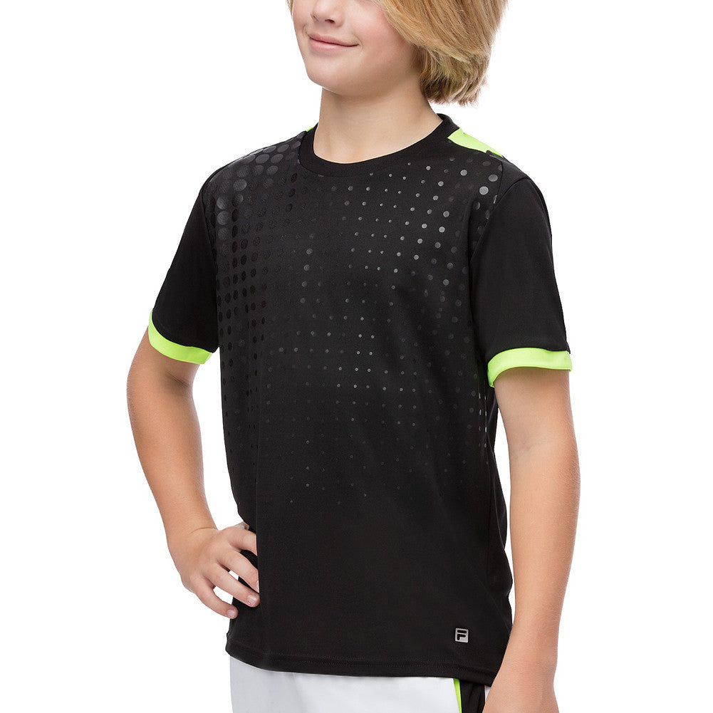 Keep your junior star cool in this crew shirt! The Fila Boy's Alpha Printed Crew uses Coolbest fabric that will keep him 2-4 degrees cooler. The fabric absorbs sweat and wicks it away from his skin. Plus he gets UV protection from the sun's harmful rays! Silver cut out F-Box logo at left hem. Material: Polyester.