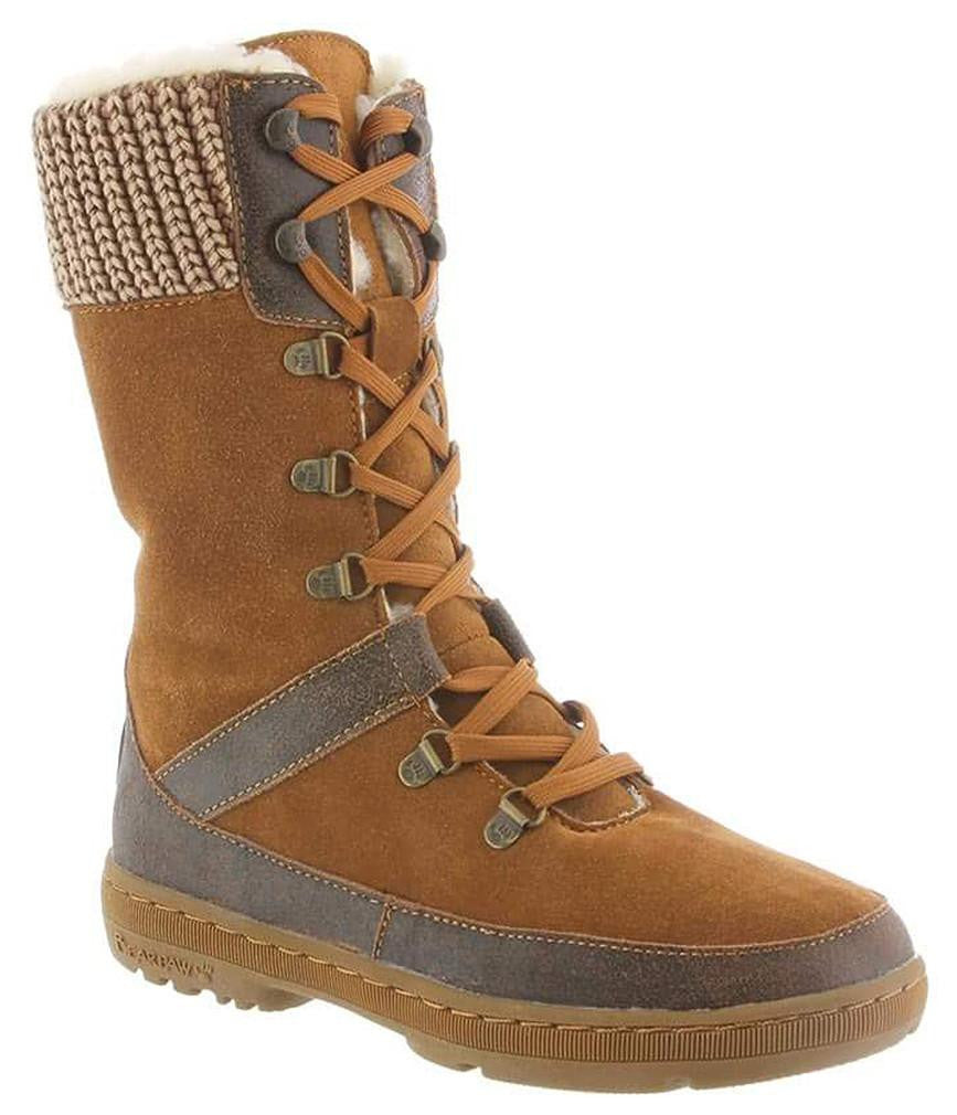 The most stylish and comfortable lace up you'll find this season. The Serena boot is made with a cow suede upper with distressed suede trim, knit back collar, and front speed lace detail. The classic wool blend lining, sheepskin footbed and classic TPR cupsole with stitched detail provide all the comfort you would expect from Bearpaw. Classic TPR cupsole with stitched detail. 9'' tall. Material: Suede, Sheepskin.