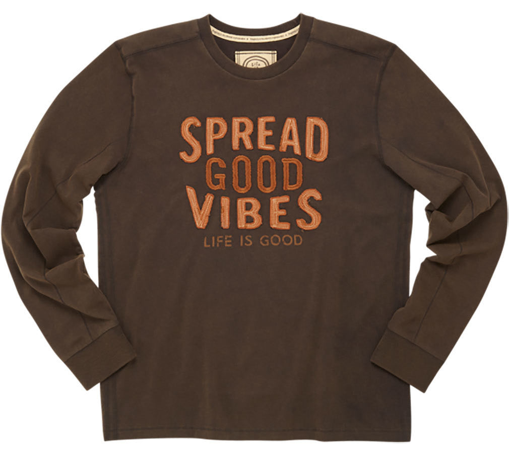 Tee Reads: Spread Good Vibes. 100% Sueded Cotton. Semi-fitted. Chroma wash. Long Sleevs. Heavy ribbed neck. Life is good label at exterior back neck.
