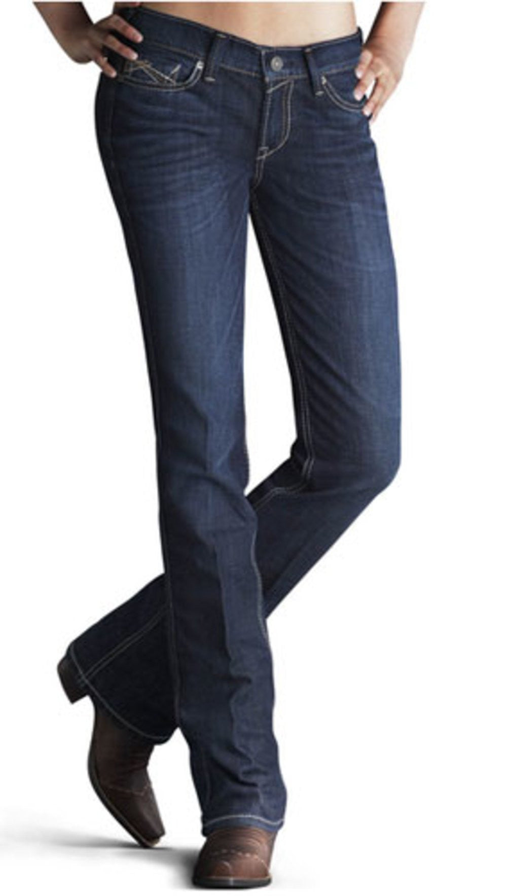 The mid-rise and boot cut make these jeans the perfect choice for every gal. The dark tinted, stonewashed finish features hand-sanding and whiskering for a slightly-worn look that will take you from the barn to downtown. These jeans have some stretch to create the perfect fit. Ariat jeans are slightly higher in the back to keep your shirt tucked in. The seams won't rub on your legs.