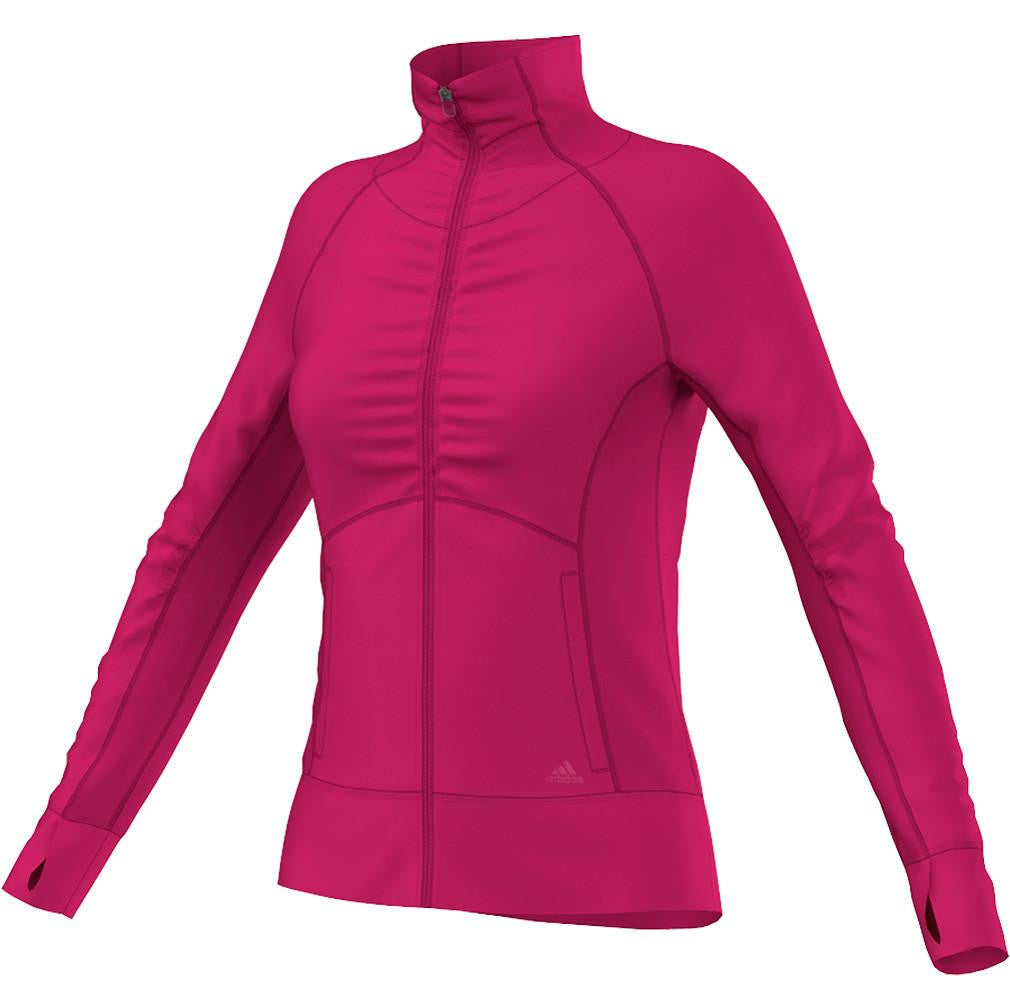 Climalite full zip jacket with closed hole mesh at side panels and upper back for ultimate breathability. Stand up collar with stay-down zipper pull. Self fabric cuffs with thumbholes. Feminine ruched detail at front and back. Banded hem. Matte silver adidas heat transfer logo on bottom left. Climalite logo on right back hem. Athletic fit. 92% Polyester/8% Elastane.