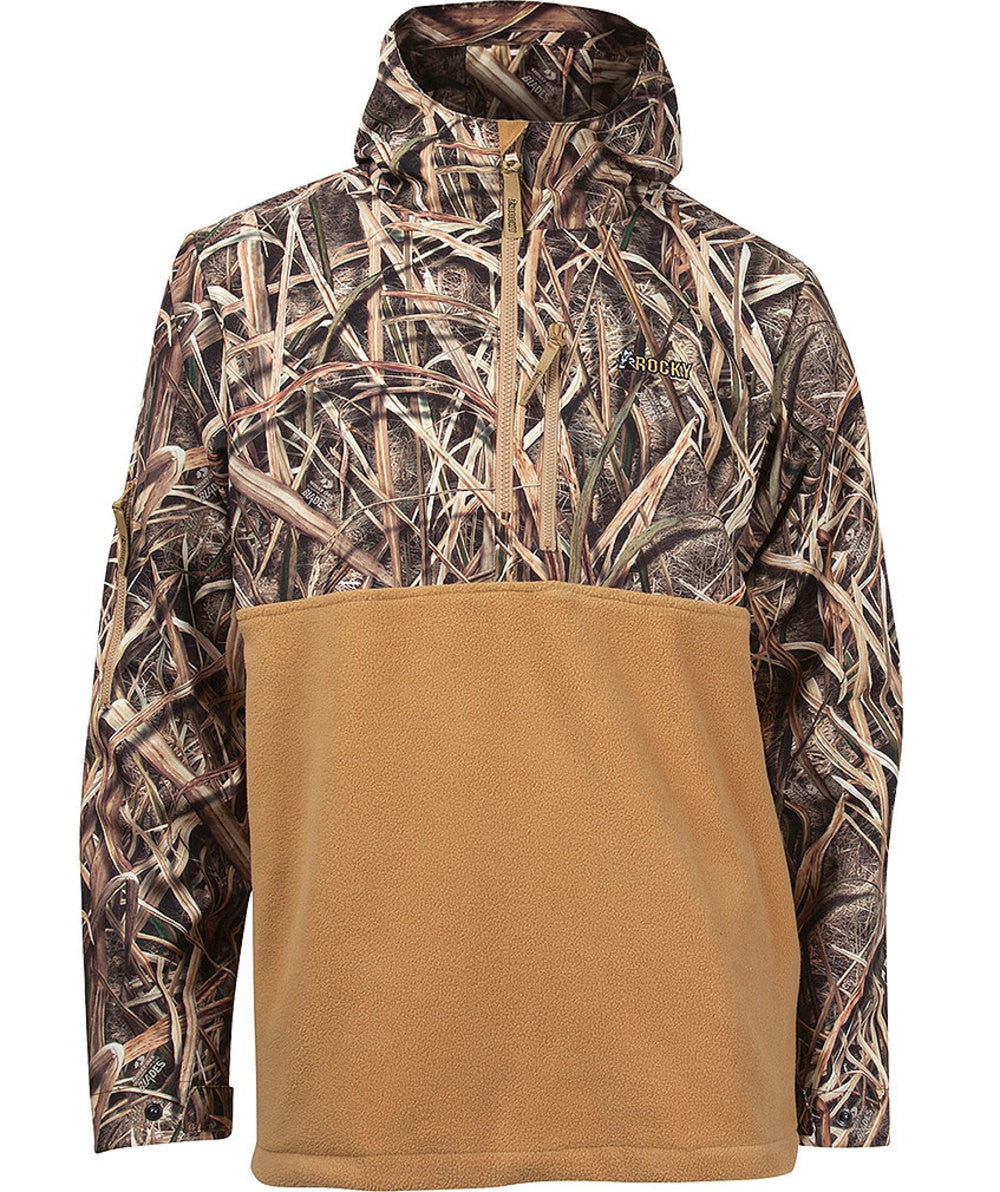 This hooded half-zip fleece shirt is good for duck hunting or just living the Rocky waterfowl hunter lifestyle. The upper body and sleeves of this men's camouflage shirt are made of waterproof and wind-resistant Taslon nylon in Mossy Oak Shadow Grass BladesTM camo. Taslon is a woven polyester fabric designed for durability and strength. It is stain-resistant and dries quickly. It also wicks moisture from your body so you're warm, but aren't sweating while on the hunt.
