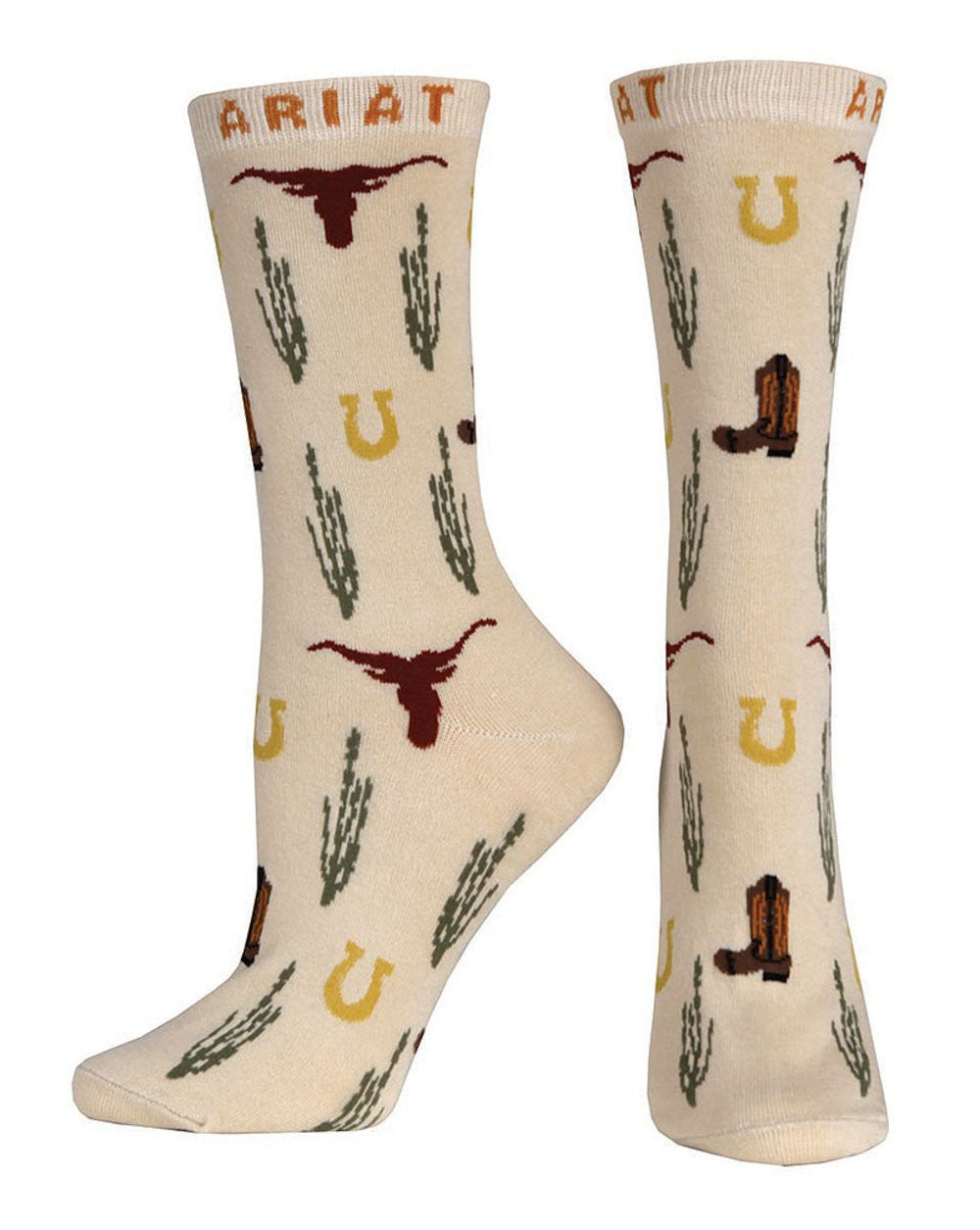 Icons of the Old West, including Longhorns, horseshoes and cactus, adorn these whimsical ankle socks. Topped with a Ariat logo band.